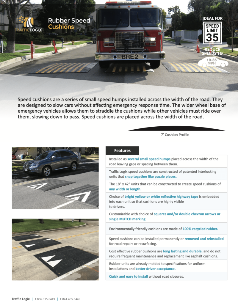 Speed cushions slow cars to between 15-20 mph. Made of interlocking units that simply snap together, Traffic Logix speed cushions are quick and easy to install. Typically 3” high and 7’ long, speed cushions are an innovative solution that can help slow speeders and protect your roads without slowing emergency vehicles.